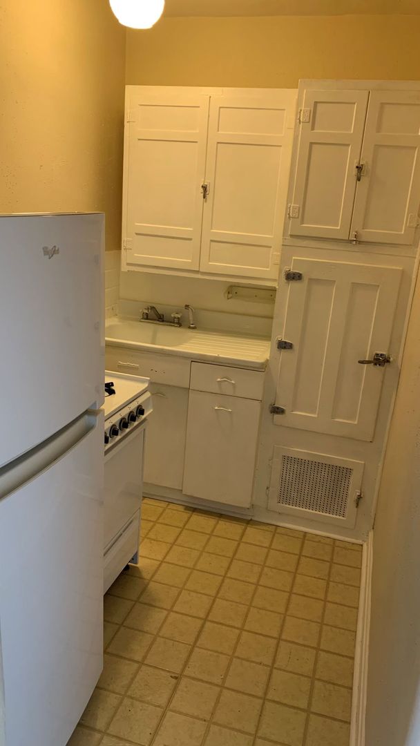 These studio apartments feature a 410 sq. ft. floor plan. The bedroom features a walk-in closet. The kitchen includes a fridge, stove, and microwave. There is on-site laundry in the building.